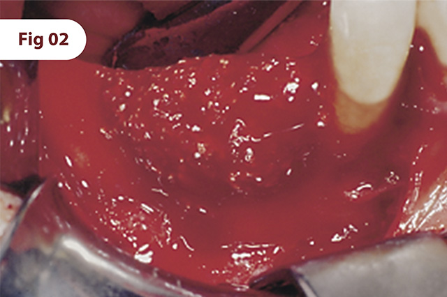 Preparo do local ad modum, protocolo de regeneração (Cruz M, 2006). Condicionamento e estabilização do coágulo com osso inorgânico bovino particulado (OIB).