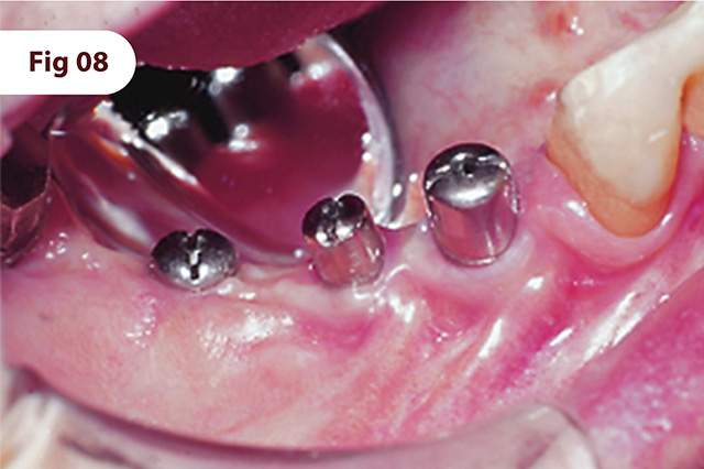A reabertura foi feita 6 meses após a instalação. Mucosa periimplantar saudável, 30 dias após a instalação dos cicatrizadores.