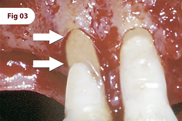 Regeneração óssea e periodontal após dez meses. Observe o ganho vertical.